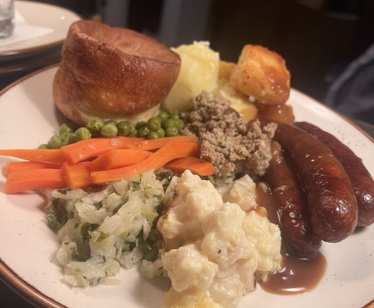 Roast and new potatoes, Yorkshire pudding, stuffing, cauliflower cheese, savoy cabbage, carrots, peas, and gravy.